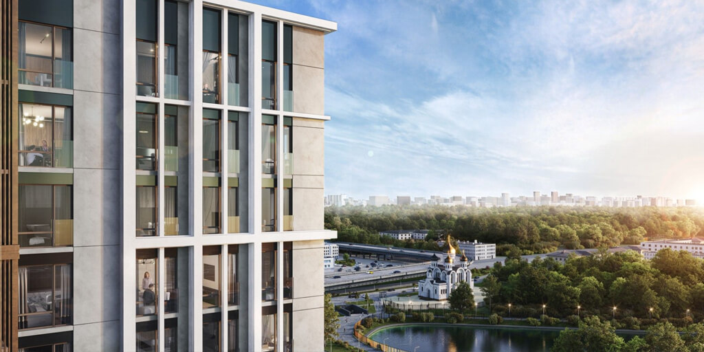 Здание оснащено панорамным остеклением и французскими балконами, что придаёт воздушность и увеличивает инсоляцию апартаментов, создавая ощущение открытого пространства. Высота потолков 4,1 м и просторные окна формируют комфортную обстановку, создающую эффект элитного жилья. Такое архитектурное решение подчеркивает статус комплекса и его эстетическую ценность.