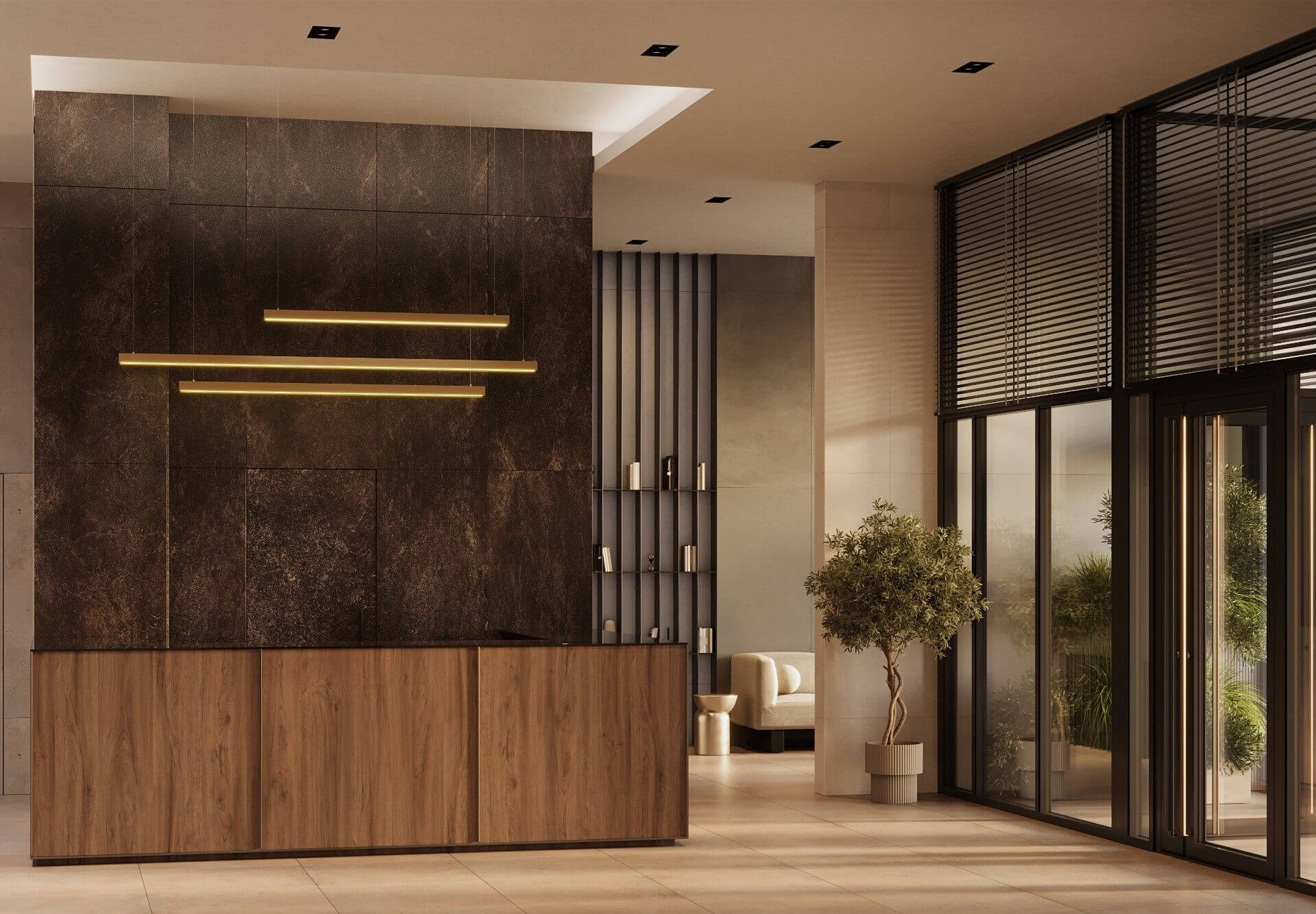 Интерьеры лобби «EVOPARK Измайлово» выполнены в стиле современной минималистичной элегантности с использованием качественных материалов, мягких цветов и дизайнерской мебели. Ресепшен оборудован удобными зонами ожидания, где резиденты и гости могут комфортно проводить время. Бесшумные лифты обеспечивают плавную и тихую транспортировку, создавая атмосферу премиальности.