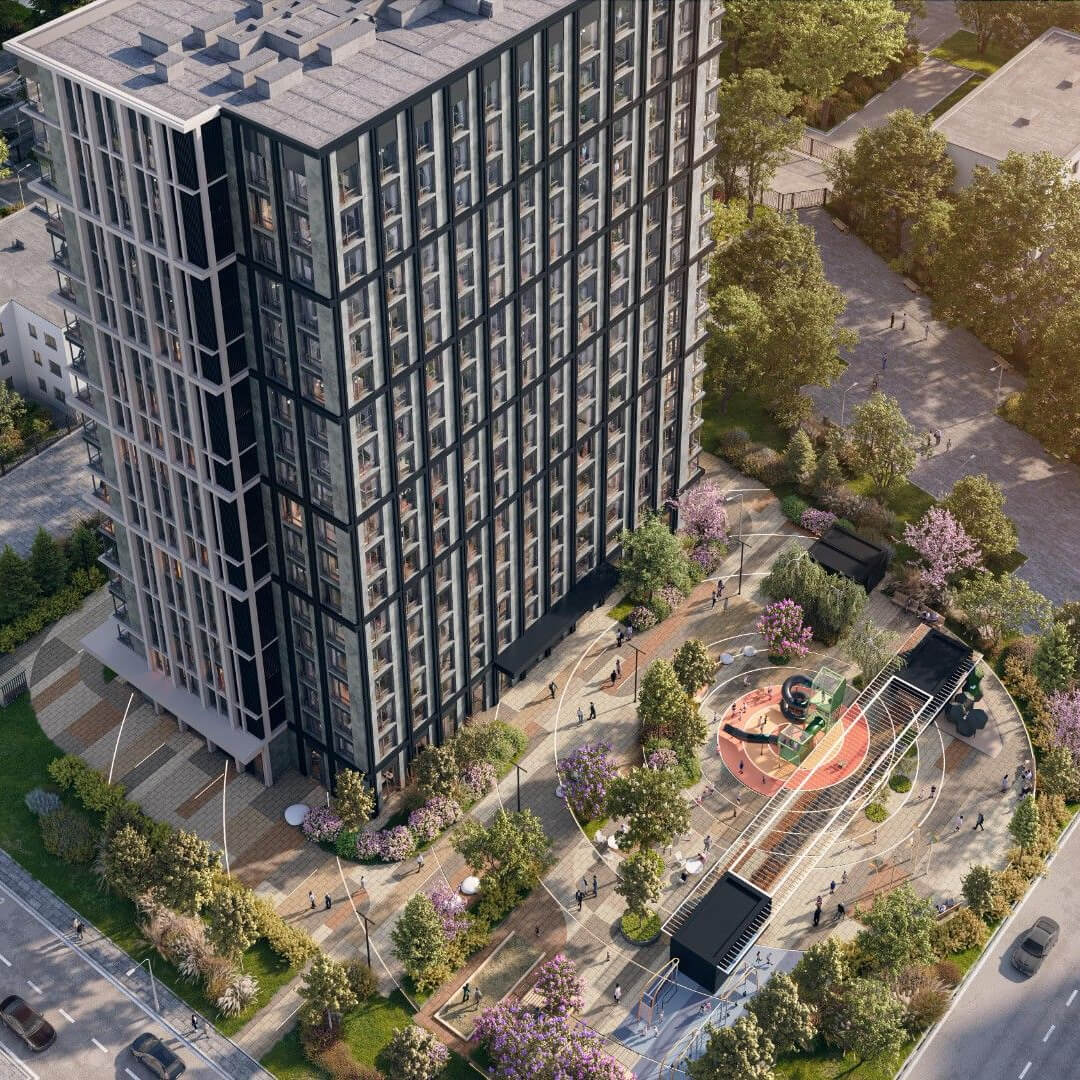Придомовая территория благоустроена с учётом архитектурной стилистики: зоны отдыха, детские площадки и ухоженный ландшафт создают завораживающий урбанистический ансамбль. К архитектурному проекту были привлечены современные дизайнеры, обеспечившие единый стиль здания, дворовых фасадов и общего пространства, подчеркивая концепцию бизнес-класса.