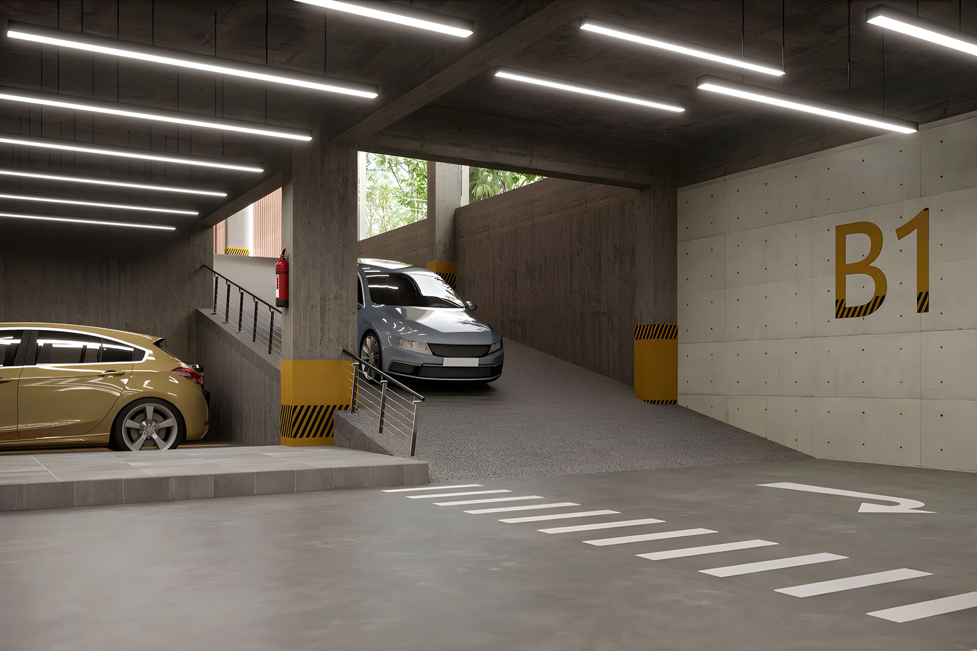 Эксплуатируемая система въезда по пропускам обеспечивает контроль доступа и исключает посторонних посетителей. Паркоместа предназначены как для резидентов, так и оборудованы для удобства гостей. Рядом предусмотрены колясочные и велосипедные лафеты — это демонстрирует заботу о городской мобильности и спортивном образе жизни.